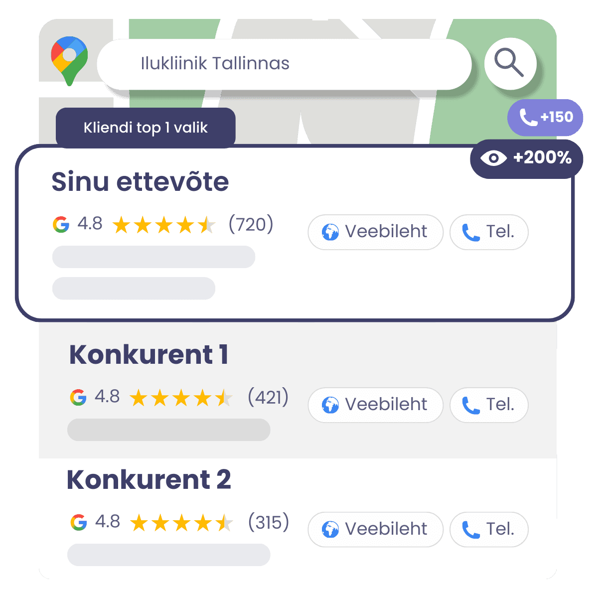 Google’i tulemustes loeb tuntus ja rohkem arvustusi ning positiivsed hinnangud võivad parandada sinu äri nähtavust. Aitame sul koguda arvustusi järjepidevalt ja hoida profiili aktiivsena, et sind oleks lihtsam leida nii Google Searchis kui Google Mapsis.