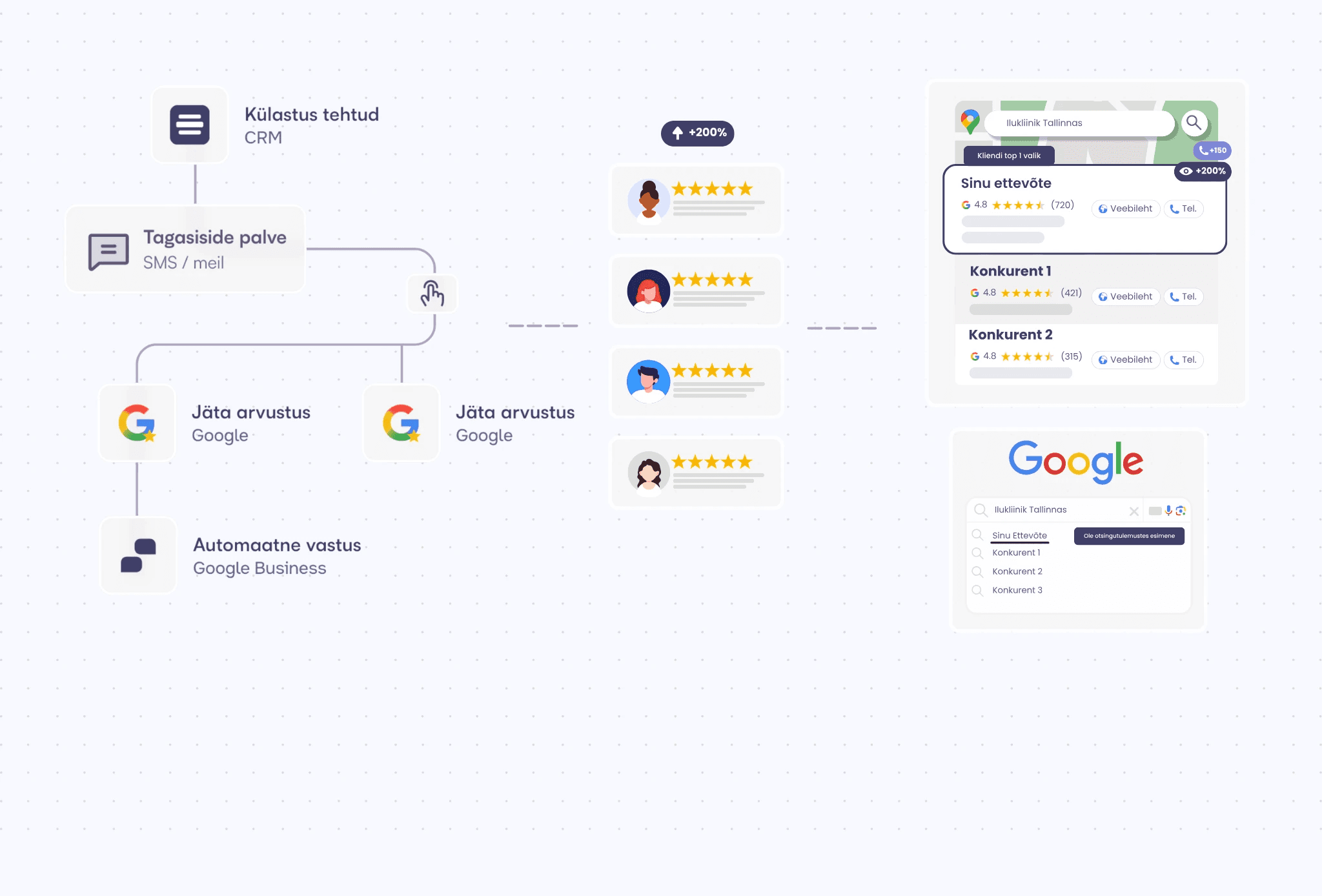 Kui arvustuse jätmine on lihtne, jätavad kliendid seda sagedamini - automatiseerime tagasiside küsitluse ja aitame sul koguda rohkem ehtsaid Google arvustusi